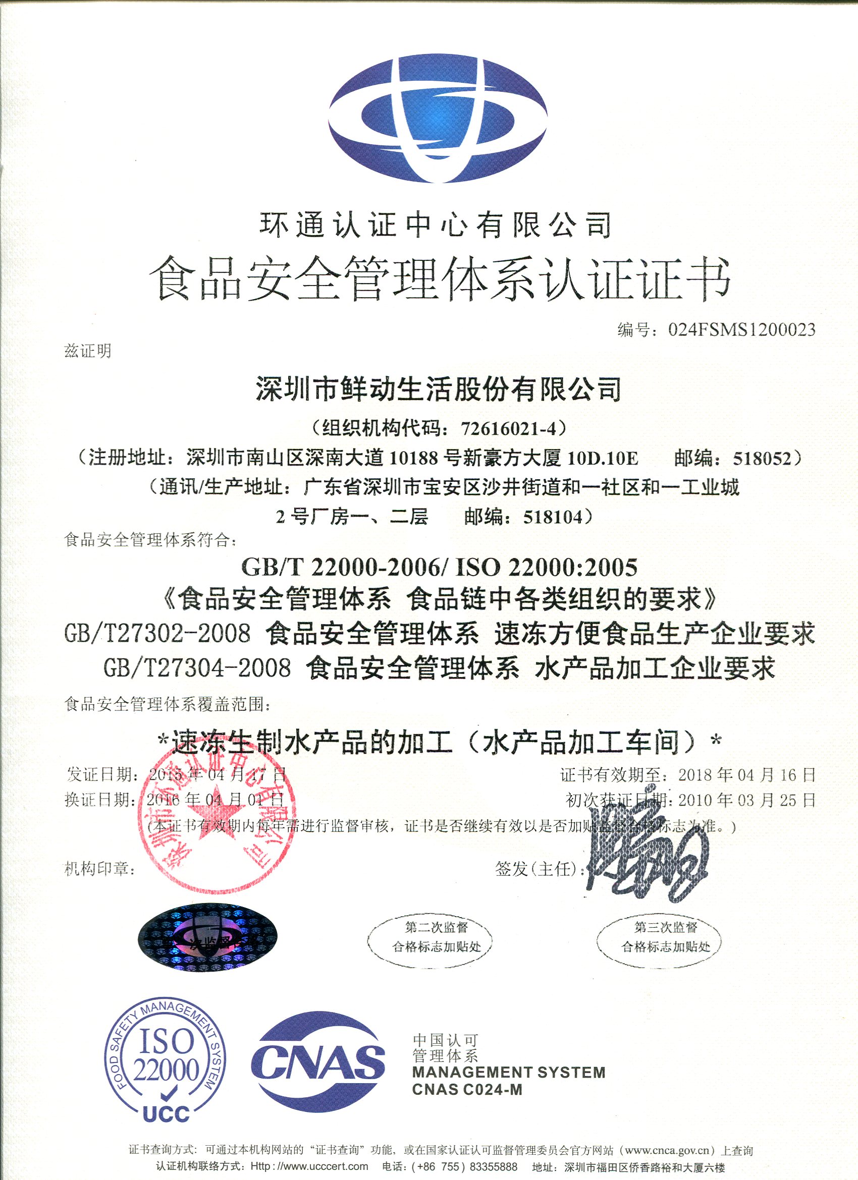 远鹏生鲜认证证书